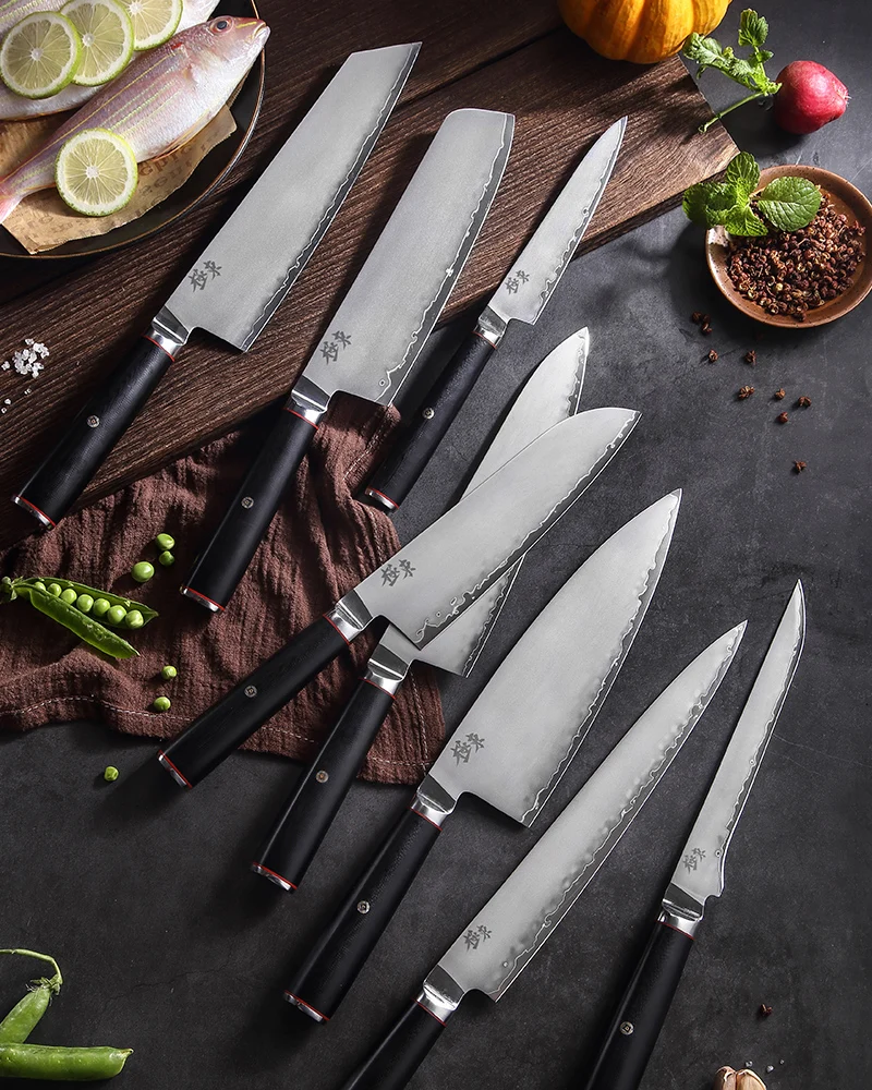 Please check the instructions carefully before buying 1: According to the purchased knife type, give a solid wood scabbard Product performance introduction 1: This product uses Japanese AUS-10 composite steel. The steel with excellent performance can guarantee the hardness, toughness, sharpness and durability of the kitchen knife. 2: When the blade angle is 15 °, a sharp kitchen knife needs to be used to process fine kitchen ingredients. High sharp kitchen knives will not destroy the fleshy fibers of the ingredients nor the taste of the ingredients. It does not crush whole tomatoes. The danger of a blunt knife far exceeds that of a sharp knife. 3: The hardness of the kitchen knife steel core is HRC60 ± 2. High-quality steel can ensure the stability of product hardness and improve durability. 4: The product is forged from 3.5mm thick steel. After many forgings, the blade body gradually became thinner, shrinking from 2.2mm to 1.7mm, which can both achieve sharpness and reduce the weight of the blade. 5: SGS Swiss authoritative testing agency tested the product, the metal content reached the standard, the carbon content was 1.01%, the chromium content was 14.9%, the molybdenum content was 0.90%, and the vanadium content was 0.28%. Good steel is the foundation of a good knife 6: The product has been tested to meet the razor standard below 100N, and the average sharpness of the kitchen knife test is 210N. Special processing can produce mirror edges and high-definition kitchen knives. 7: Forged knives accentuate the beautiful wavy lines of the blades, with gorgeous burned blade lines as Japanese Seiko